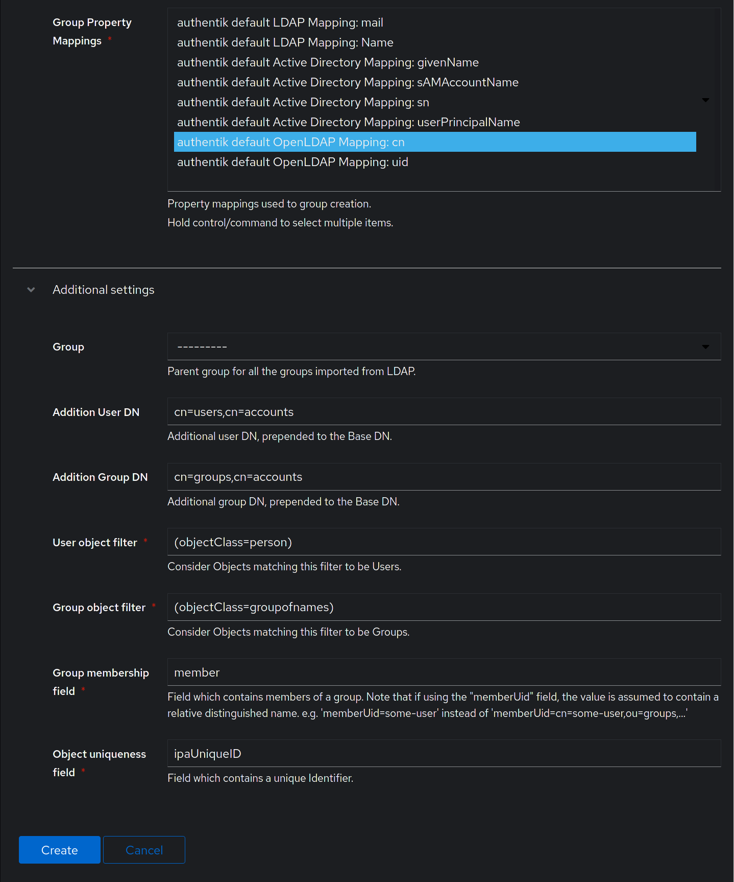 Group property mappings: Select "authentik default OpenLDAP Mapping: cn"