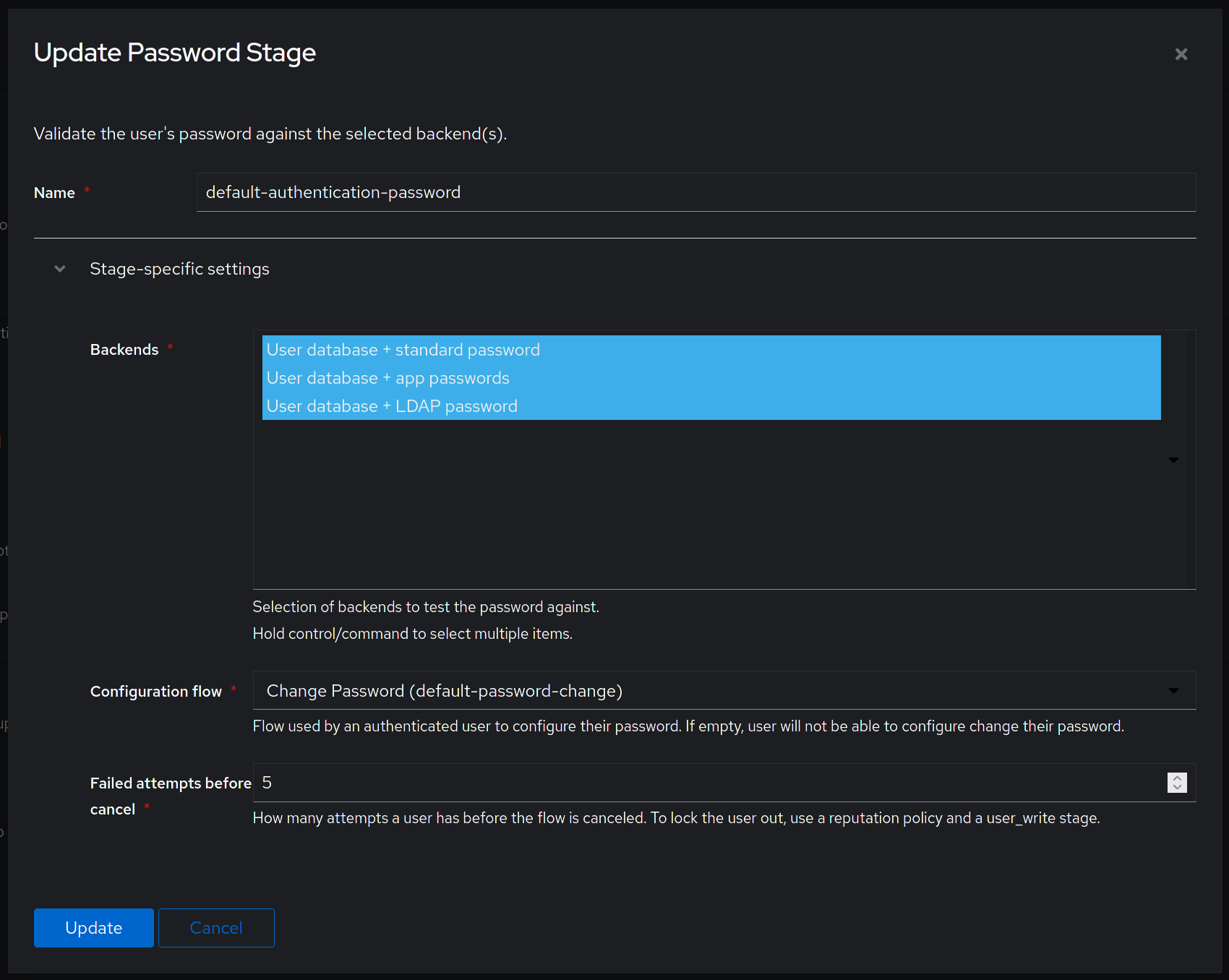 Lastly, verify that the "User database + LDAP password" backend is selected in the "Password Stage" under Flows -> Stages.